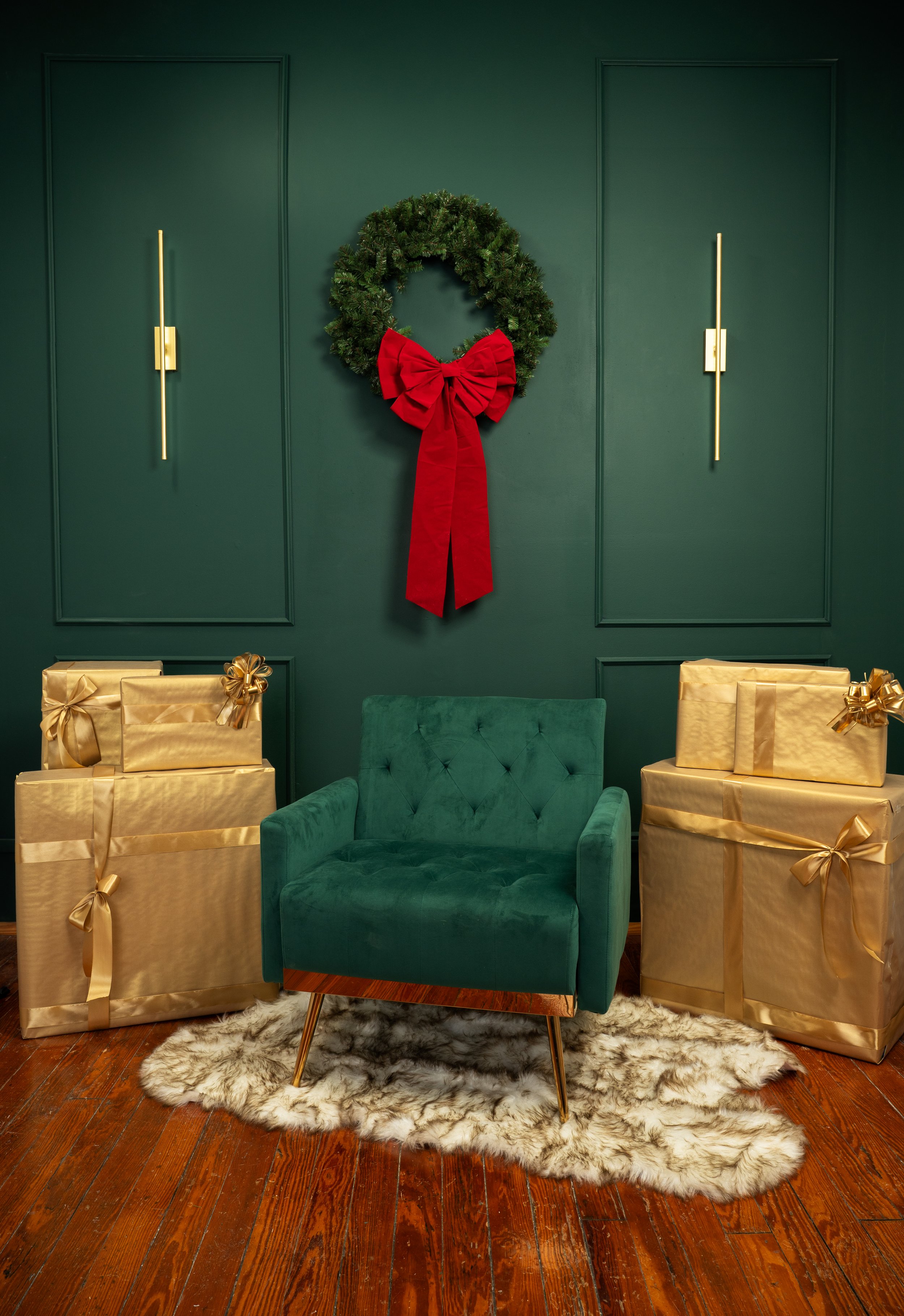 A styled creative space featuring an emerald accent wall, 86” backdrop system, professional lighting, posing props, and a full makeup station. Includes a kitchenette, steamer, and lounge seating.